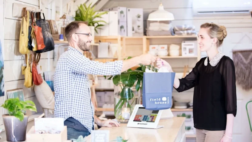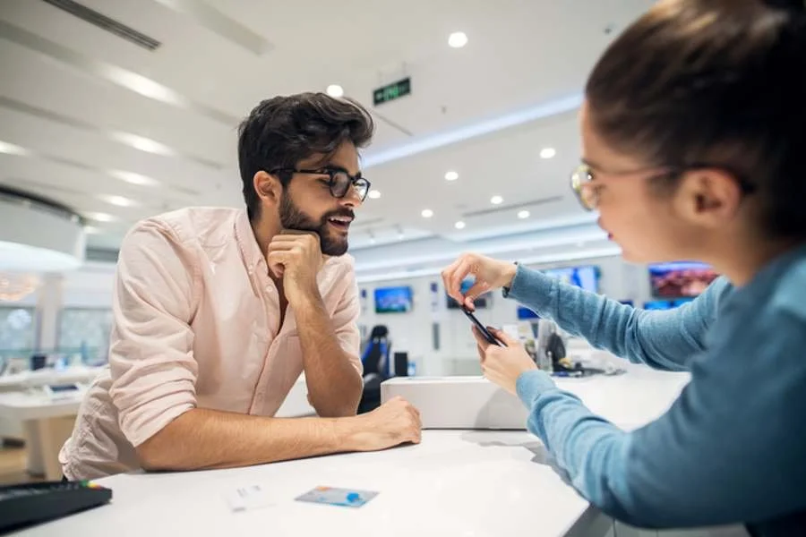 A customer receives assistance with a smartphone purchase in an electronics storefitsmallbusiness