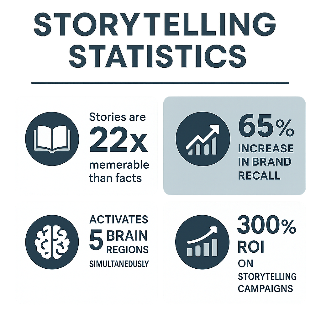 This neurological foundation explains why stories are not just memorable—they’re transformative 4. According to Stanford Research, stories are up to 22 times more memorable than facts alone, creating lasting impressions that influence purchasing decisions long after the initial encounter 415.