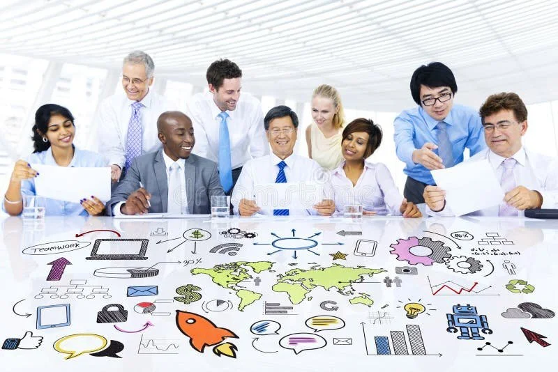 Diverse Business Executives Brainstorming Strategic Plans With Colorful Business Illustrationsdreamstime