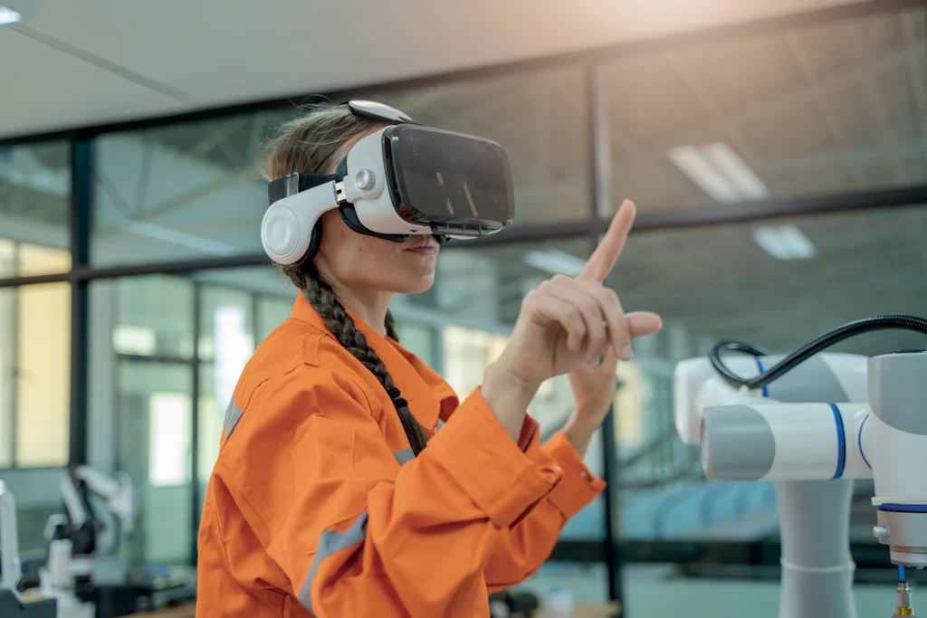 Person using virtual reality headset for immersive industrial safety training with robotic equipment nearby