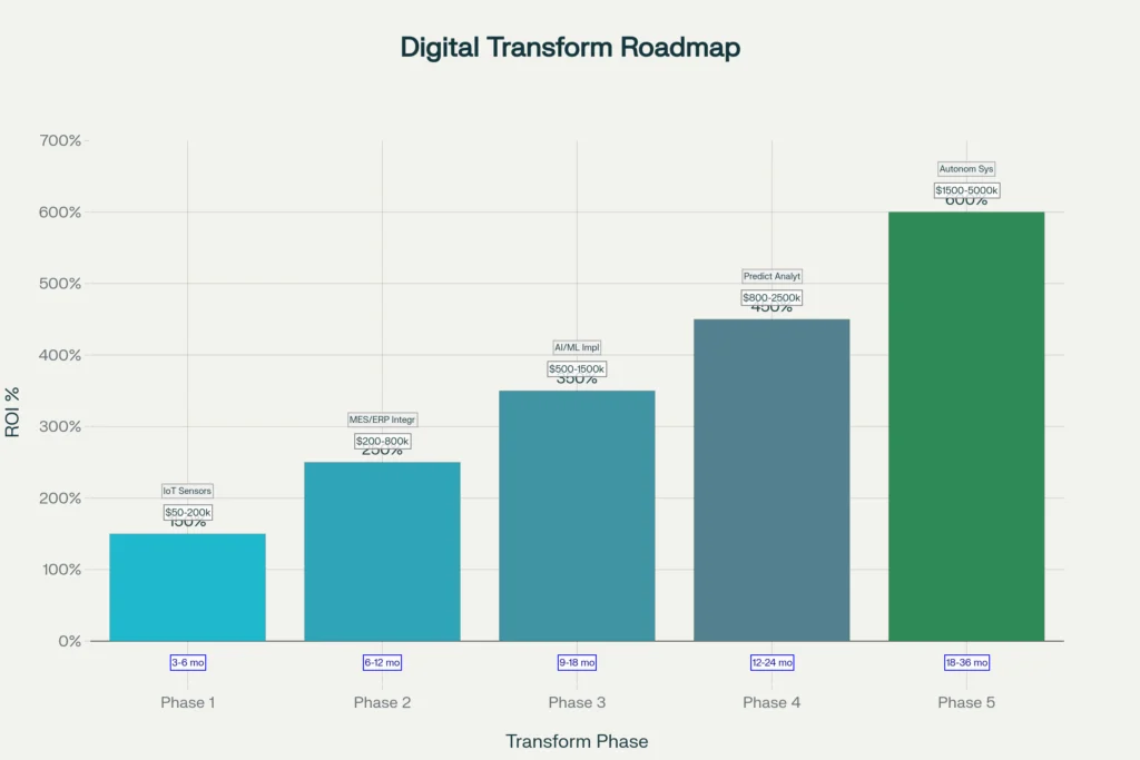 Phase 1: Foundation Building focuses on establishing basic IoT connectivity and sensor networks with investments ranging from $50,000 to $200,000. This phase typically delivers 150% ROI within 3-6 months by providing immediate visibility into previously opaque manufacturing processes.