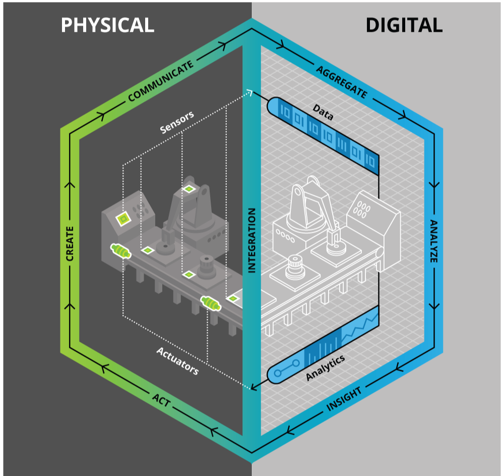 Visualisation of Industry 4.0 principles showing the integration of physical industrial processes with digital data analytics through sensors, actuators, and digital twins for smart manufacturing