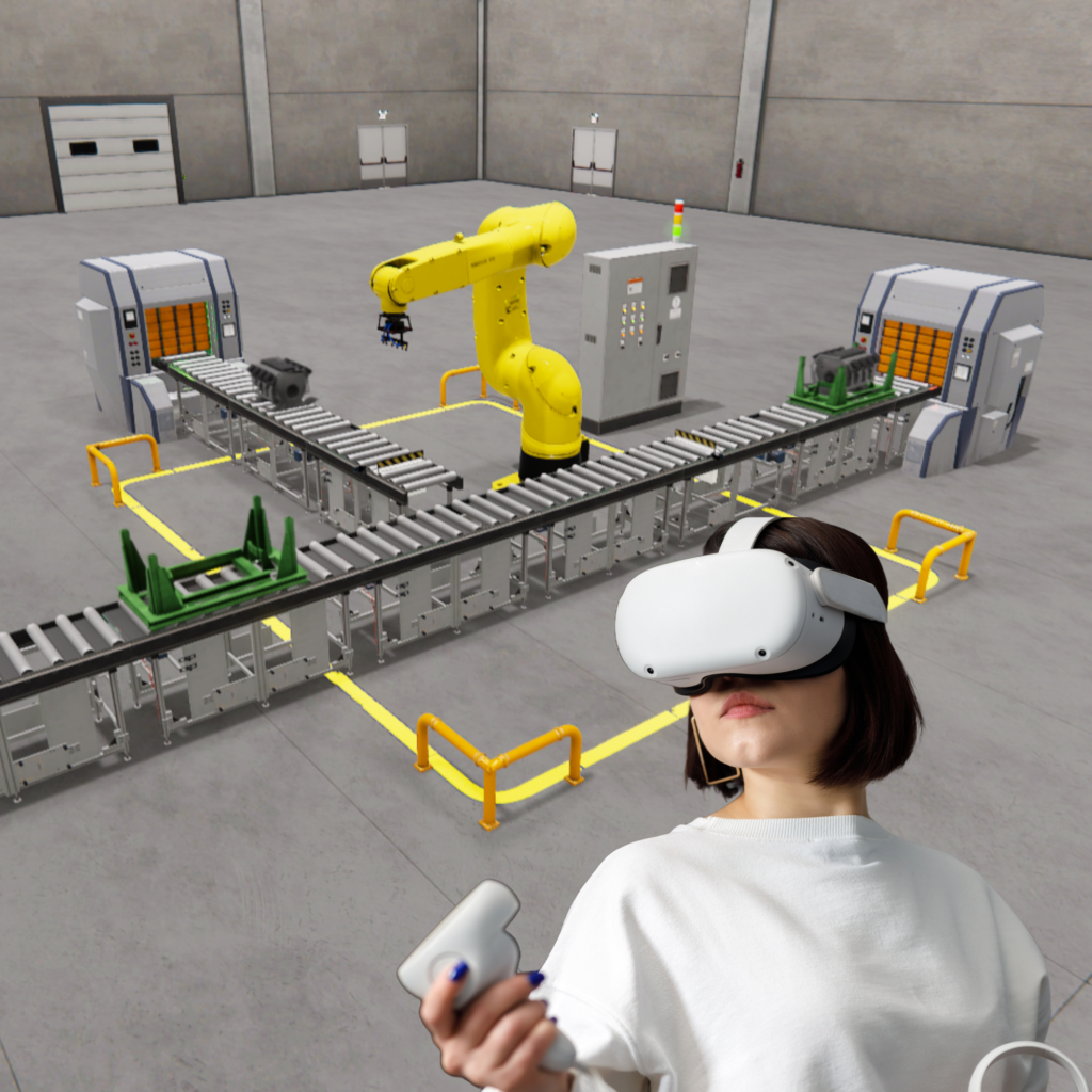 Person using virtual reality to simulate industrial automation and safety training in a factory environment