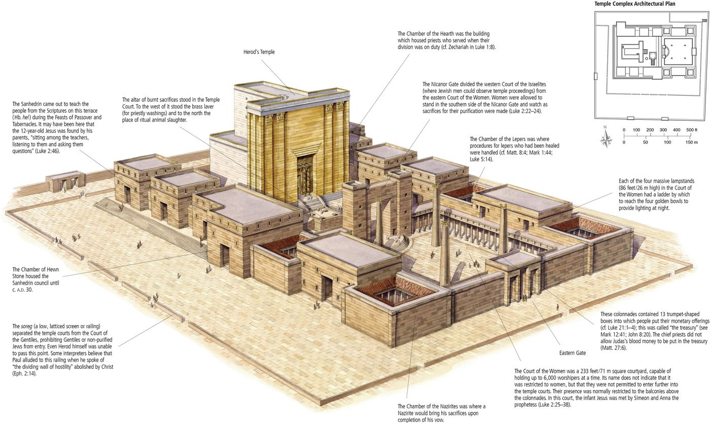 When the Gospels and the book of Acts refer to entering the temple or teaching in the temple, it is often not a reference to Herod’s temple itself, but rather to this temple complex, including a number of courts and chambers that surrounded the temple. These latter structures were the great and wonderful buildings referred to by the disciples in Matt. 24:1; Mark 13:1–2.