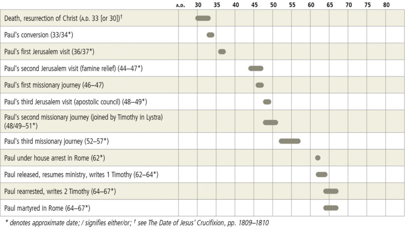 Some critics have suggested that 1 Timothy does not seem to fit into the narrative of Acts. Others have responded that it could fit into the events in Acts 20. However, the traditional position has been that Paul was released from his first Roman imprisonment (the one mentioned at the close of Acts; see Acts 28:16, 30–31), did further mission work, and was then imprisoned a second time, leading to his execution. This reconstruction is supported by statements from 1 Clement 5.7 and Eusebius,Ecclesiastical History 2.22.2–8. First Timothy then would fit well during Paul’s work between the two imprisonments. If Paul’s arrival in Rome, as narrated in Acts, is dated about a.d. 59–61, then, allowing a couple of years for the imprisonment, he would have been released in about 62. If Paul was executed under Nero (d. a.d. 68), 1 Timothy would have been written somewhere in the mid-60s (cf. note on Acts 28:30–31).