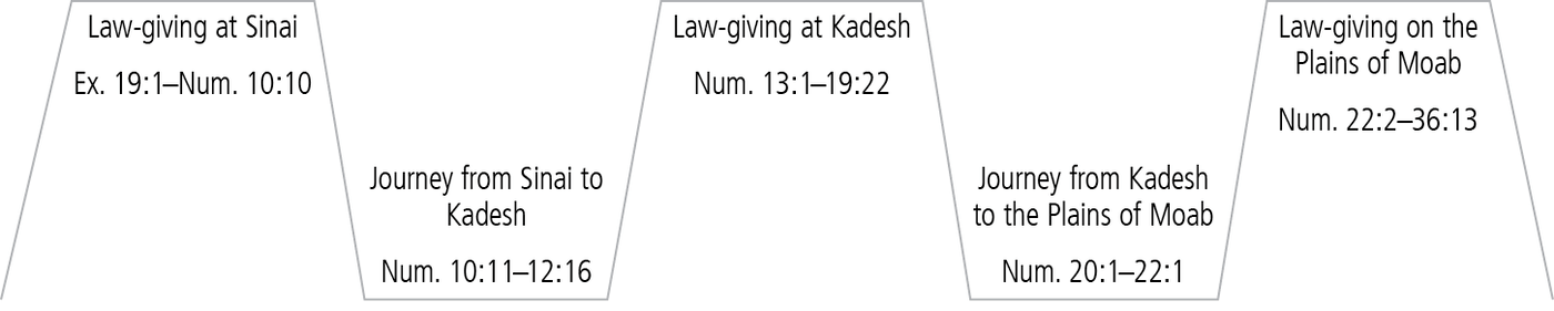 Numbers consists of three major blocks of material describing the events and laws associated with three centers where Israel encamped for a significant time. These centers are Sinai (chs. 1–10), Kadesh (chs. 13–19), and the plains of Moab (chs. 22–36). They are linked by two short travelogues recording what occurred as Israel journeyed from one camp to the next.
