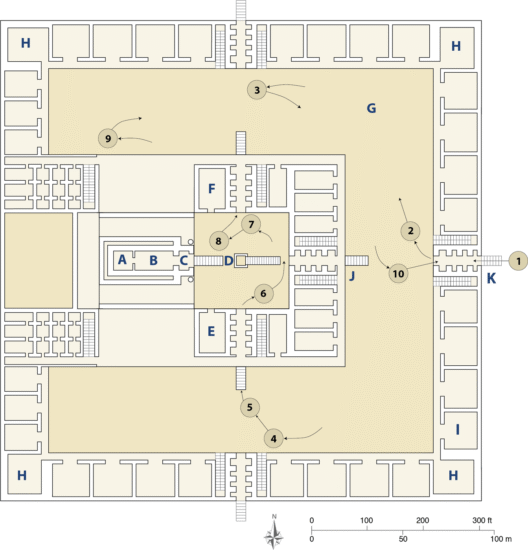 The city of Babylon reached its zenith under Nebuchadrezzar II (Nebuchadnezzar of Scripture, who reigned 605–562 b.c.). He restored and enlarged it, making it the largest city seen in the world up to that time. The Euphrates River flowed through it, with the oldest quarter of the city lying on the east bank of the river. The city was surrounded by a city wall with fortified gates that were named after the various Babylonian deities. The Esagila Complex on the east bank of the Euphrates contained the Temple of Marduk with its associated seven-storied ziggurat Etemenanki.